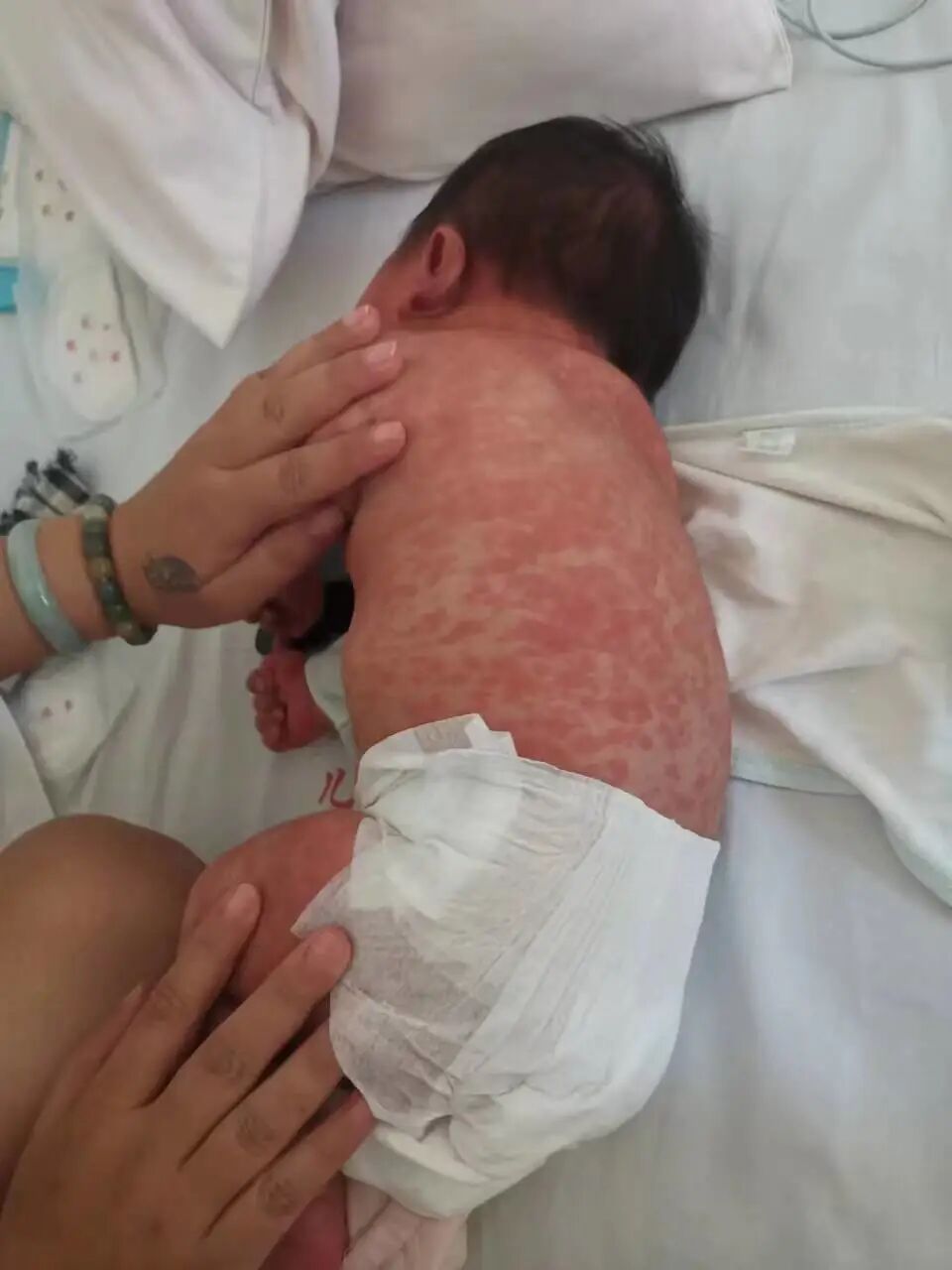 乐乐入院后,鄂州二医院儿科主任高作良、医生何克强、丁永春等医护人员观察发现她浑身长满红疹,哭声低哑、呼吸急促、口唇有发紫,病情十分危重,医护人员全程陪同做了相关检查后考虑疑似毒性红斑,合并重度心肌炎、肺炎,立即开展全面的治疗。